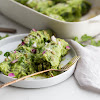 - Bake enchiladas for 20 minutes then remove from oven and let cool slightly. Top with avocado sauce, red onions, fresh cilantro, and ground almonds.